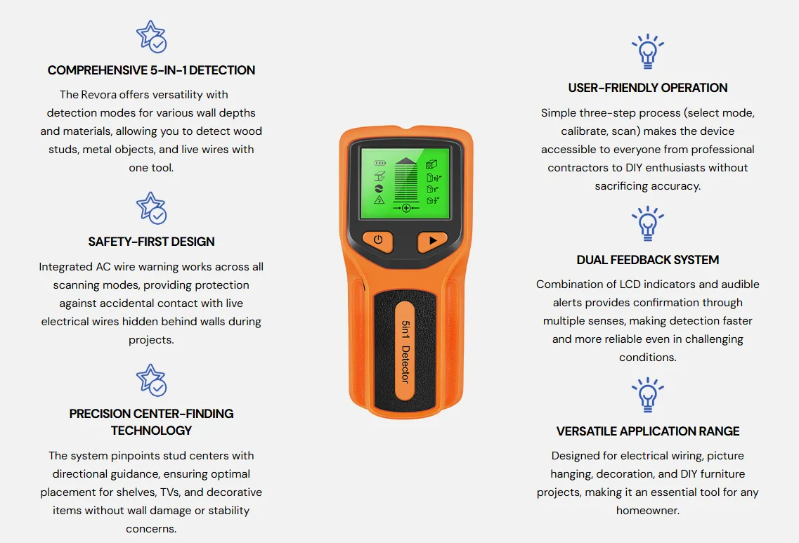 Stop guessing what's behind your walls! Revora finder offers 5 dedicated depth scanning modes, optimized for wood, metal, and live AC wires. Easily switch between modes to penetrate thin drywall or thick structural supports, ensuring you locate your target with absolute confidence for every job.